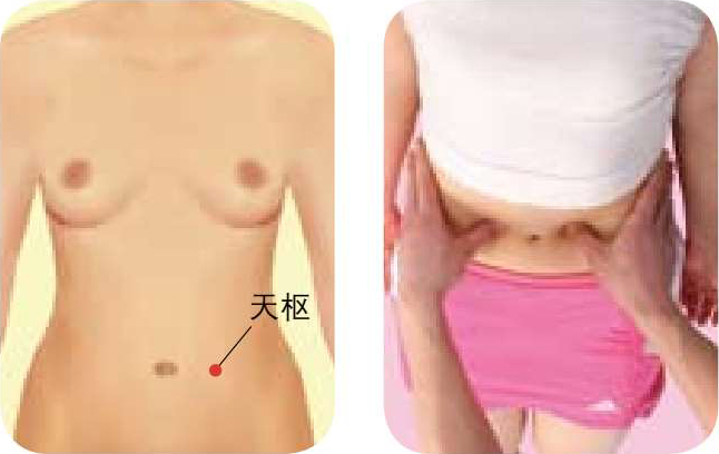 ● 按摩方法 :被按摩者仰卧,按摩者用拇指或中指按压天枢穴约半分钟,然后按顺时针方向按摩约2分钟,以局部感到酸胀并向腹部放射为佳。