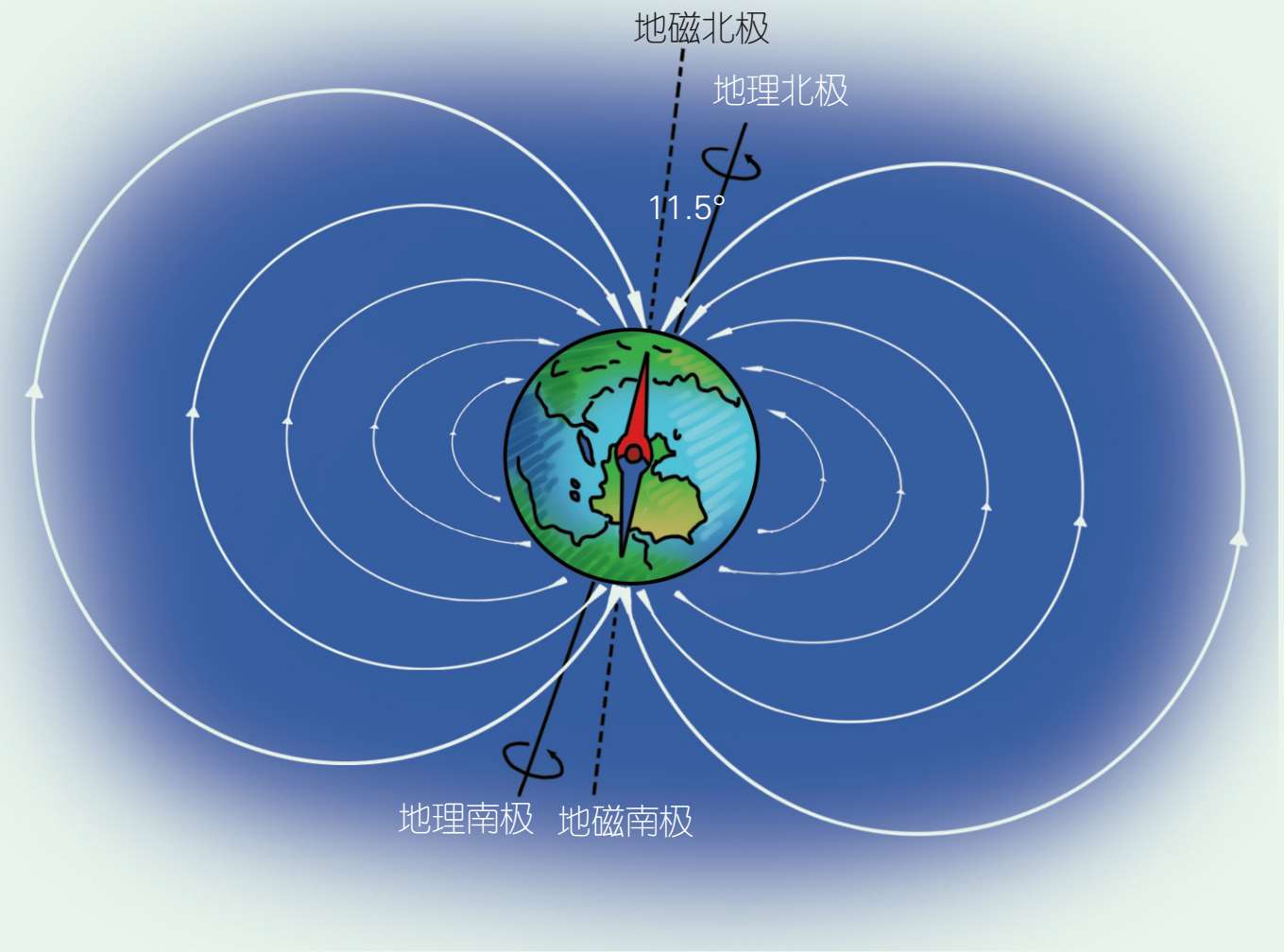 磁性物质都有两极——磁南极和磁北极。当两个磁性物质靠近时,同性相斥,异性相吸。地球有一个由地核形成的巨大磁场,称为地磁场。指南针上的磁针与地磁场相互作用,静止时,磁针南极指向地磁北极方向,磁针北极指向地磁南极方向。地磁场的磁北极位于地理北极点附近,磁南极位于地理南极点附近。地磁南极和地磁北极与地理上的南、北极点距离很近,但两者位置并不重合。指南针指向的是地磁南、北极的方向,与地理上的正南、正北方向有一定偏差,这一偏差的角度称为磁偏角。