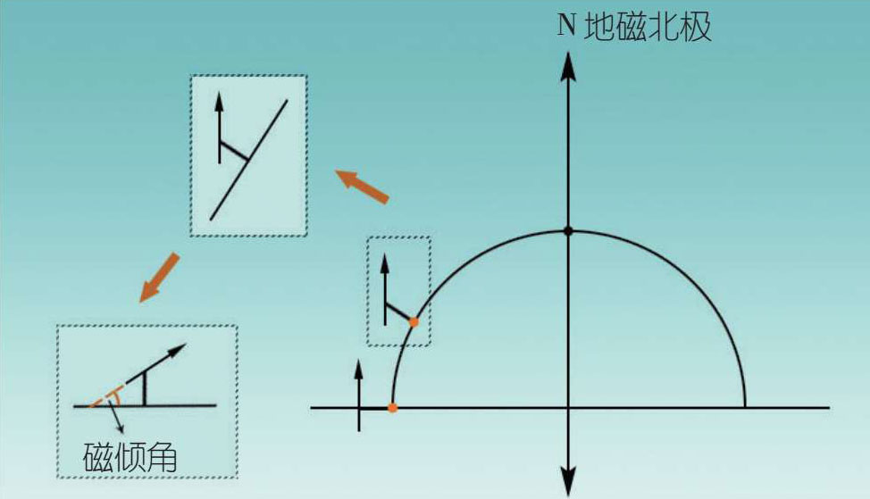 地面上的磁针永远与所在地地磁场磁感线的切线方向平行,由于磁力线呈弧形,除赤道外,在地表上的任意一处,以地表水平面为参照系,磁针总是指向地表水平面的斜上方。磁针与地表水平面之间的夹角称为磁倾角。纬度越高,磁倾角越大,在南、北极点处,磁倾角为90°。中国古代文献中没有明确提到磁倾角,但从中国古人制作指南针的一些做法中可以推断,他们已经知道磁倾角的存在,并在制作指南针时适当进行校正。