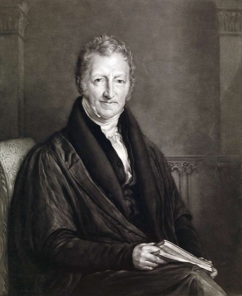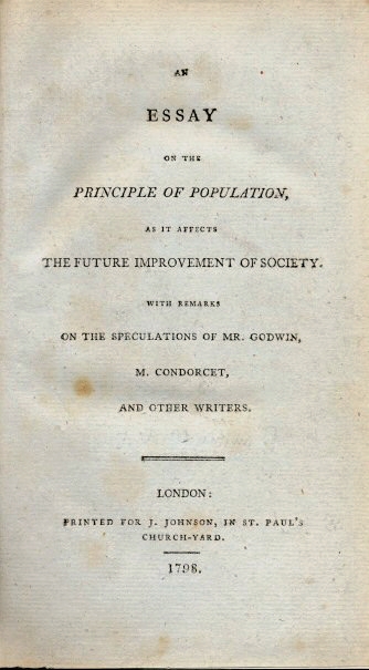 在英国社会哲学家葛德文和法国哲学家孔多赛的影响下,英国经济学家马尔萨斯于1798年匿名发表了《论影响社会改良有前途的人口原理,并论葛德文、孔多赛并其他作家的推测》,这就是《人口论》的第一版。其主要思想是,在所有的社会中,即使是压迫最严重的社会,人口的增长(趋向于指数式)也会大大快于食物供应的增长(线性式),所以总有一天人口会超过食物供应的极限,到那时,社会阶级较低的人将会变得贫穷,生活将仅能糊口,甚至出现战争、瘟疫和饥荒,从而人口锐减;之后,由于人口减少人们又会得到丰足的食物,然后人口再次快速增长,直至贫困和罪恶再次发挥作用,如此循环反复。《人口论》的出版引起了英国政府的警惕,从1800年开始每10年就进行一次人口普查。