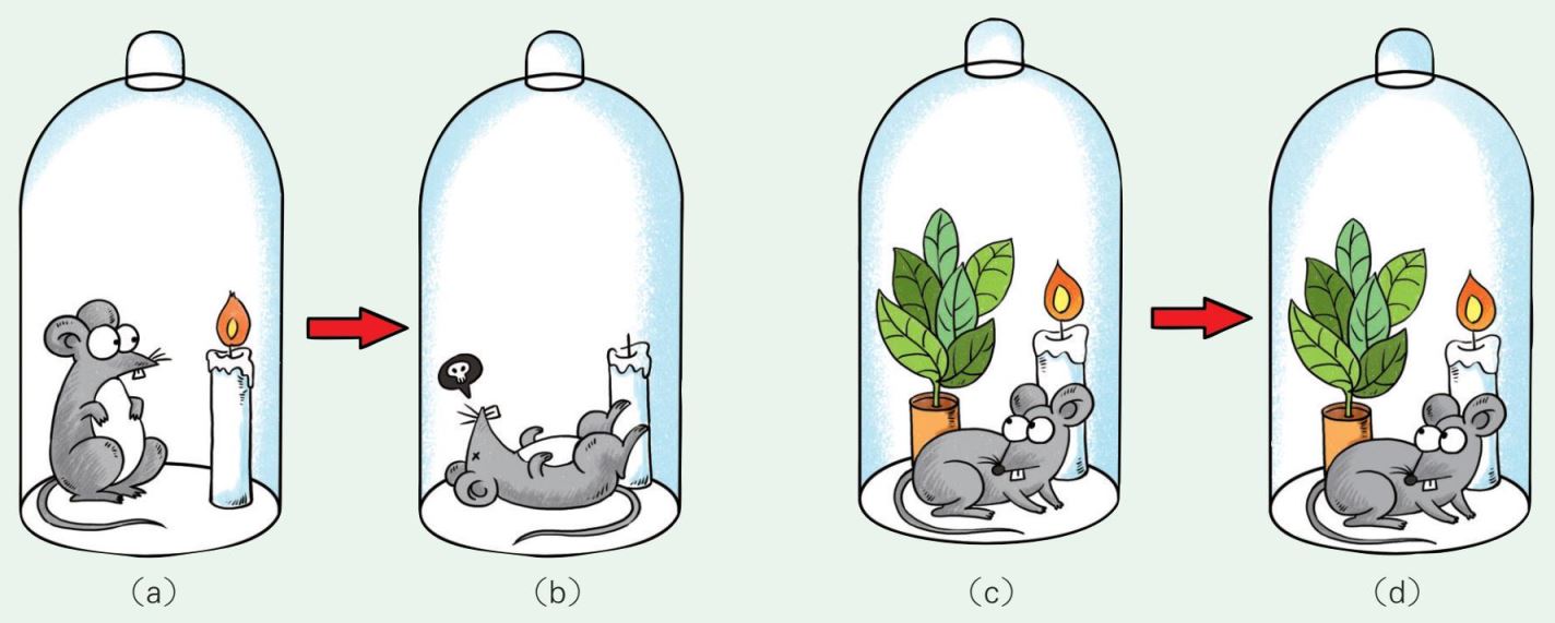 100多年后,英国化学家普里斯特利迈出了第二步。普里斯特利把一支点燃的蜡烛放在密封的玻璃罩内,蜡烛不久之后熄灭,这时,如果把一只小老鼠放进玻璃罩中,小老鼠很快一命呜呼。然后,他把点燃的蜡烛和一盆植物同时放到一个密封玻璃罩内,发现蜡烛能长时间燃烧,而植物不仅没有死,还长出了花蕾。如果同时把小老鼠放进去,小老鼠也能活上很长时间。他认为,空气中可能存在不只一种气体:其中一种是“干净的空气”,蜡烛燃烧时,这种空气就会被污染,产生一种“污浊的空气”,而植物可以净化污浊的空气。不过,在重复这个实验时,有时候成功,有时候失败,这令科学家百思不得其解。这期间,随着气体化学研究的不断进步,人们已把“污浊的空气”命名为二氧化碳(CO2),而把“干净的空气”命名为氧气(O2)。