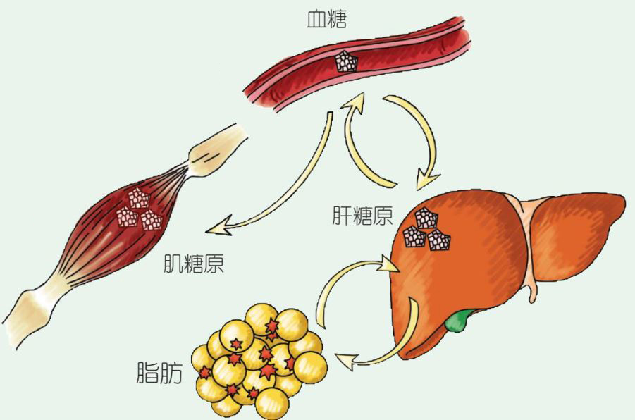 1929—1940年,捷克—美国生物化学家卡尔·科里和格蒂·科里夫妇发现,葡萄糖通过血液流动,被送往全身各处,在身体细胞中,葡萄糖被分解并产生能量;血液中葡萄糖浓度升高,表示糖分多余,此时血糖可转变为肝糖原将能量暂时储备起来,也可以转变成肌肉中的糖原(肌糖原),供给肌肉活动。合成糖原后剩余的血糖则可转变为脂肪,还可以在转氨酶的催化作用下转变为某些氨基酸。