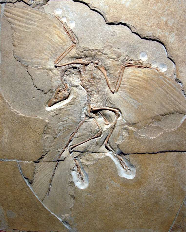 在达尔文发表《物种起源》后的第二年,也就是1861年,人们在德国的一个采石场里发现了一块从未见过的化石,化石中的动物有类似鸟类的羽毛,但又有类似恐龙的牙齿、尾巴和指尖。后来,人们把它命名为始祖鸟,认为这是现代鸟类的“老祖宗”,能够证明鸟类是从爬行动物进化而来的。
