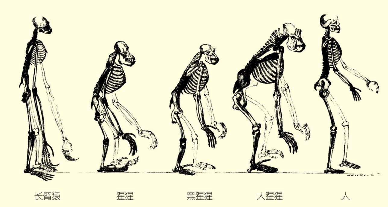 1863年版《人类在自然界中的位置》中灵长类几个物种的骨骼差异图Ⓦ