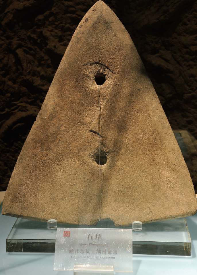 此外,1980年,在同属崧泽文化的上海松江汤庙村遗址,考古工作者还发现了一件距今5000多年的耕田用的农具——三角形石犁。这是中国迄今为止发现的最早的石犁之一。石犁的体型扁薄,平面呈等腰三角形,两腰即为刃部,单面斜刃,上下两面打磨比较平整,犁身上琢出圆孔,可以装在木柄上使用。石犁的出现在中国农业史上具有极其重要的意义,说明当时的稻作农业已进入犁耕农业阶段。犁耕突破了以往锄耕缓慢的一点一穴或上下一个反复只能松一块土的作业模式,不但提高了劳动生产率,也提高了翻地的质量,革命性地提高了生产力,标志着新石器时代农业发展新阶段的开始。