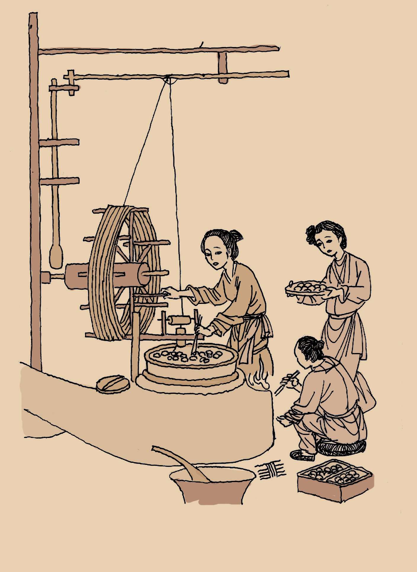 要将蚕茧加工成宜于纺织的纤维,要经过缫丝、练漂及其后续工艺络丝、并丝、捻丝等工序。中国古代不仅形成了完整的蚕丝初加工工艺,而且还发明了相应的工具。蚕丝的主要成分是丝素和丝胶。丝素是近于透明的蛋白纤维,丝胶是黏性的胶质物,包裹在丝素的外面。丝素不溶于水,丝胶则溶于热水。要使丝素宜于纺织,必须将丝胶除去,这道工序就是缫丝。