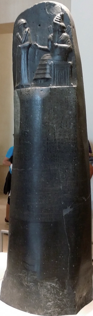 汉穆拉比在统治之初,就继承苏美尔—阿卡德时代各邦的法律,并结合当时当地的习惯法汇编成一部法典——《汉穆拉比法典》。这是目前已知的世界上最早的一部完整保存下来的成文法典。这部法典在当时究竟有多少种文本流传,现在已经不得而知了,今天所能见到的版本是法国考古学家于1901年发现的。该法典全文用阿卡德语写成,共3500行,刻在一根高2.25米的黑色玄武岩石柱上(石柱现存巴黎卢浮宫博物馆),所以又被人们称为“石柱法”。石柱上端是一幅精致的浮雕,内容为汉穆拉比国王从太阳和正义之神沙马什手中接受象征王权的权杖的图像,浮雕以下刻有16栏文字,石柱背面接着刻有28栏文字,这些文字的内容就是《汉穆拉比法典》。