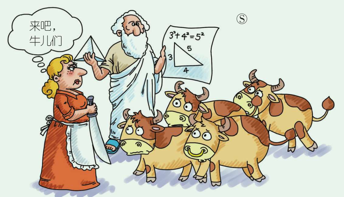 万物皆数的思想大概是源于对数字之美的崇拜。随手就可以找到让人着迷的例子:365=10 2 +11 2 +12 2 ,6 2 =1 3 +2 3 +3 3 ……在毕达哥拉斯学派看来,宇宙的本质就是数。他们认为,1是所有数的神圣缔造者,2是一个女性数,3是一个男性数,4代表公正,5代表婚姻……如今似乎没有多少人知道这些了,大概是因为这一套理论在现代人看来是如此“荒谬”。毕达哥拉斯学派有一个特点,就是将算术和几何紧密联系起来,并在他们的探索中发现并证明了毕达哥拉斯定理。这一定理的发现让毕达哥拉斯学派欣喜若狂,传说他们宰杀了一百头牛来庆功,所以该定理又得了一个绰号,即“百牛定理”。