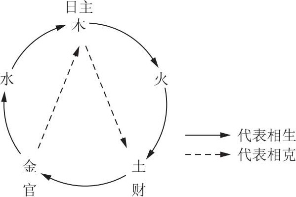 既然用正五行,所谓“官”,就是克制日主的五行;所谓“财”,就是日主所克的五行。比如日主是木,那么五行金就是日主的“官”;而五行土,则是日主的“财”。可以图示如下: