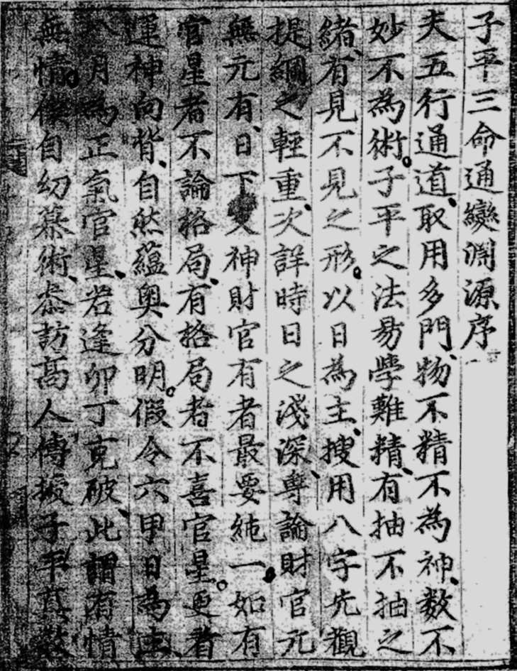 子平之法,易学难精。有抽不抽之绪,有见不见之形。以日为主,搜用八字。先观提纲之轻重,次详时日之浅深。专论财官元有元无,日下支神财官有者,最要纯一。……更看运神相背,自然蕴奥分明。……