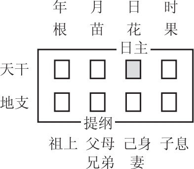 在这个框架中,六亲的位置也进一步确定了。因为取消了古法模型的胎元一柱,“祖上”就移到了年柱,父母、兄弟则在月柱,日干为己身,日支为妻,时柱为子息。同时,徐子平以四柱中原有的为“根”,运中再遇而发福者为“果”。这里,徐大升跟徐子平立说不同,分别取年、月、日、时为根、苗、花、果,后人基本上采取了徐大升之说。