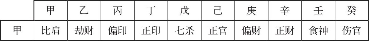 即:以甲日干为出发点,甲遇到甲,为比肩;甲遇到乙,为劫财(败财);甲遇到丙,为偏印;甲遇到丁,为正印;以此类推。关于十神的具体内容,我们将在第六章里予以进一步解释。