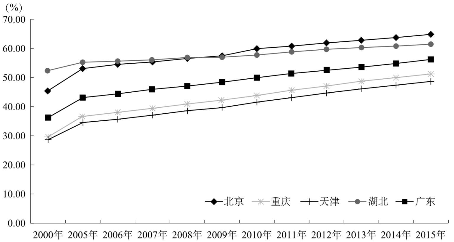 图2-4 2000—2015年我国若干省市城镇化水平