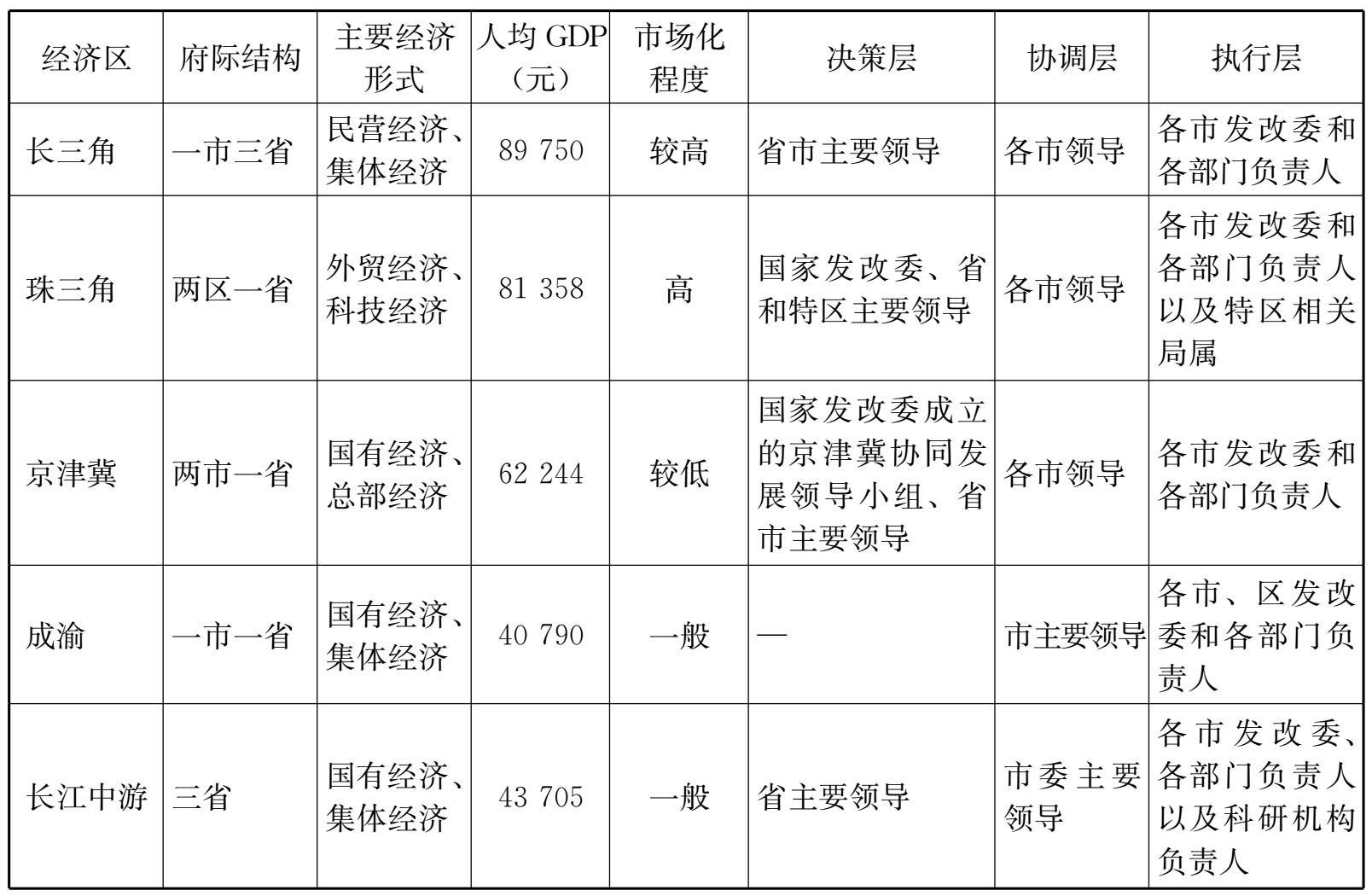 表2-7 我国主要经济区区域协调发展机制汇总
