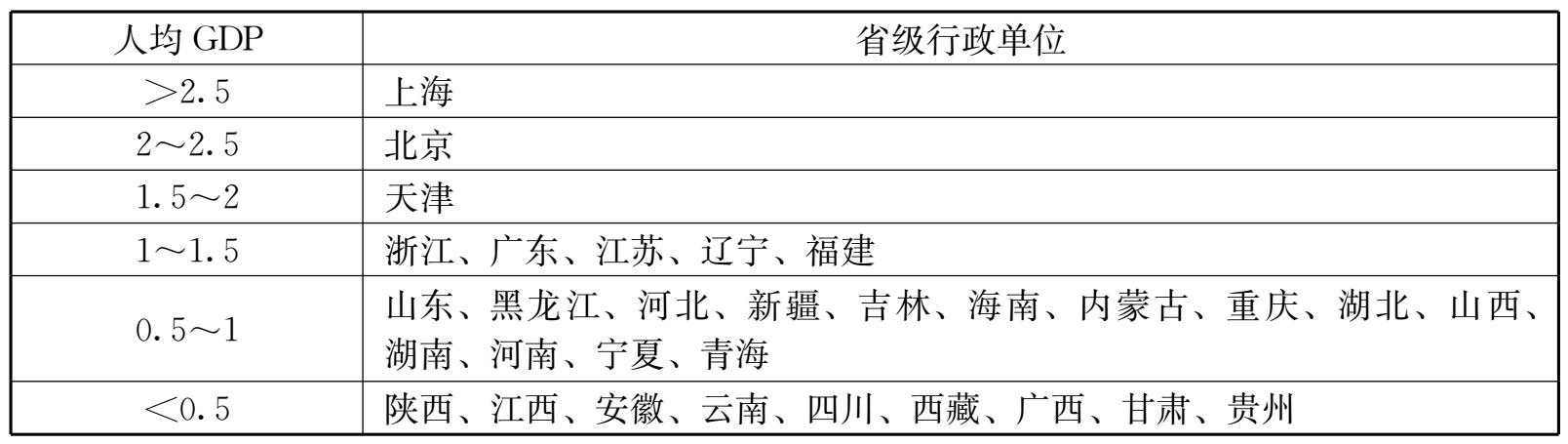 表2-5 2015年各地区人均GDP格局单位:万元