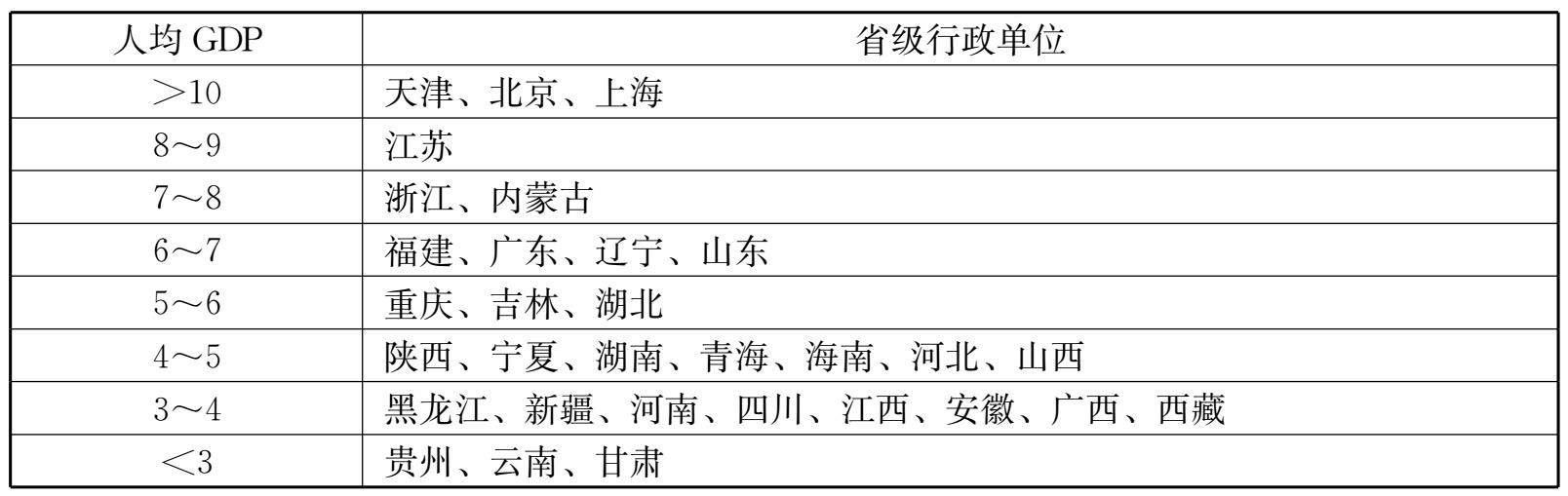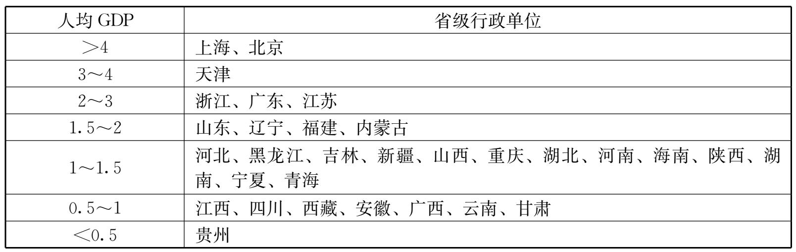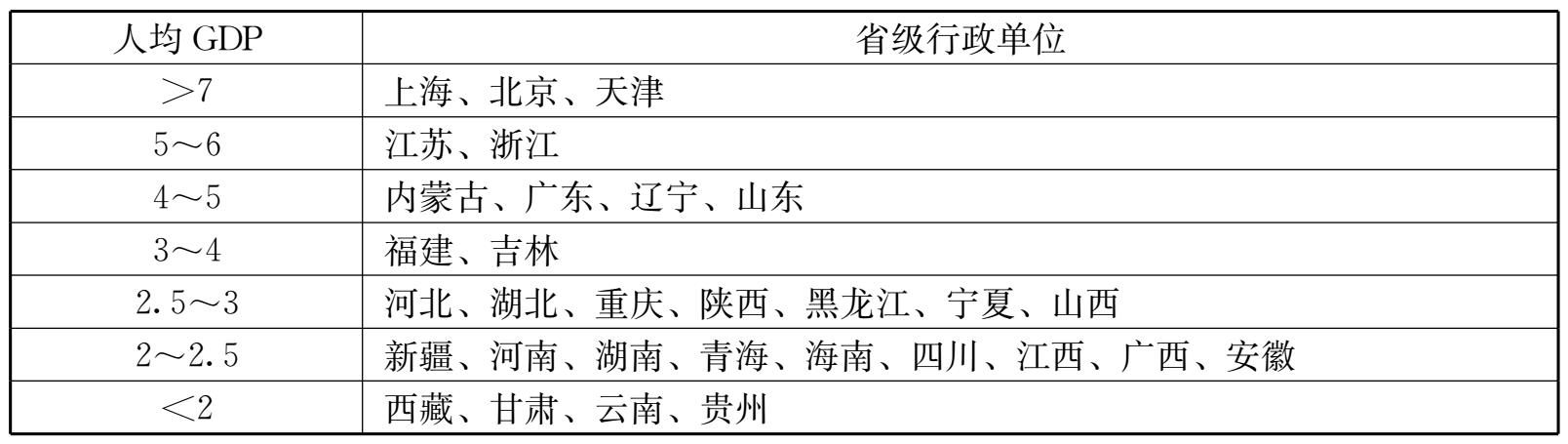 表2-3 2005年各地区人均GDP格局 单位:万元