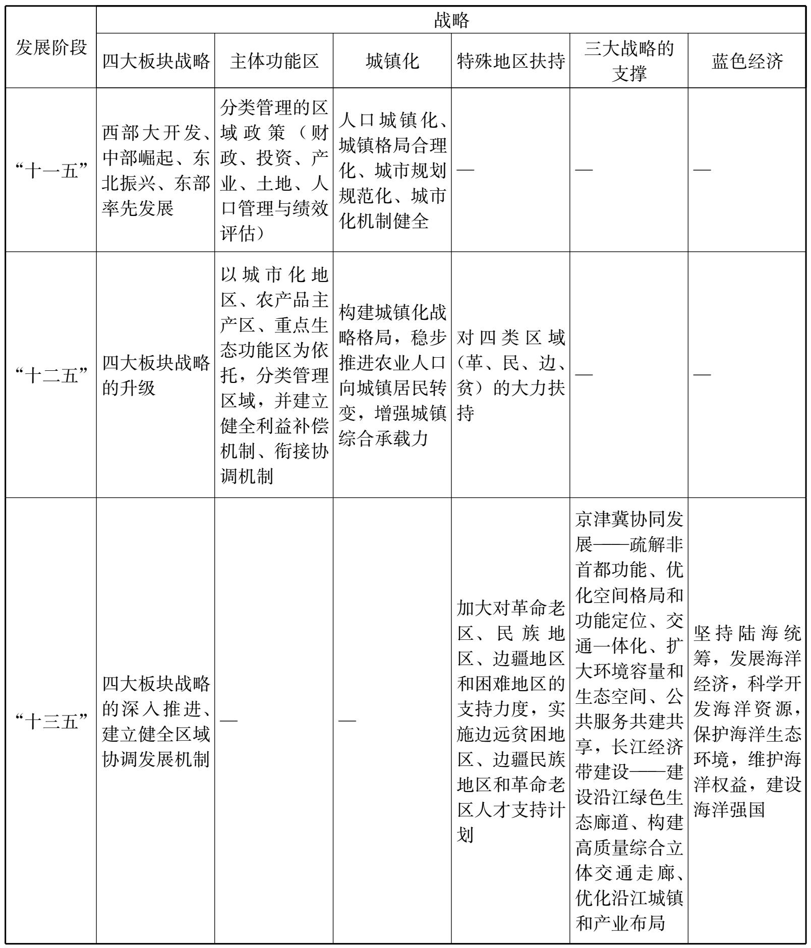 表2-6 “十一五”“十二五”“十三五”规划中“区域协调发展”战略对比