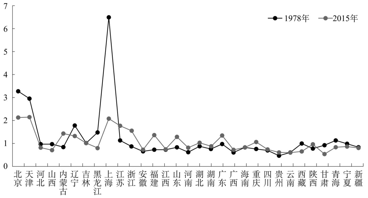 图2-2 1978、2015年中国各省份人均GDP指数