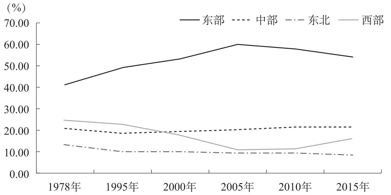 我国区域划分先后经历了新中国成立后的沿海内地“二元”时代、“七五”时期东中西“三元”时代和“十一五”时期东中西东北“四元”时代,区域关系从沿海内地的海陆地理关系转化为具有显著经济集聚特征的社会经济关系。总体而言,我国区域差距变化最大的时期是20世纪90年代后期和21世纪前10年。