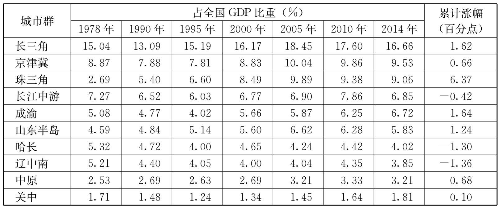 表2-1 1978—2014年中国主要城市群占国家经济比重变动趋势