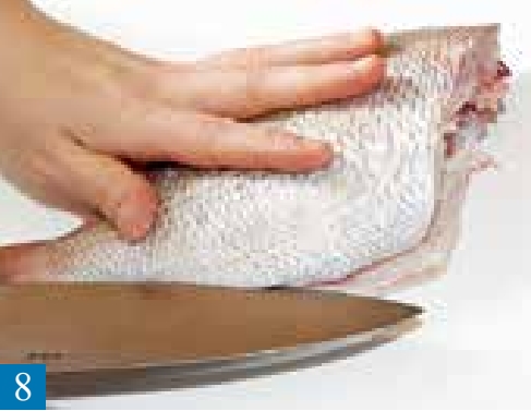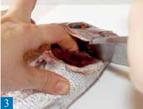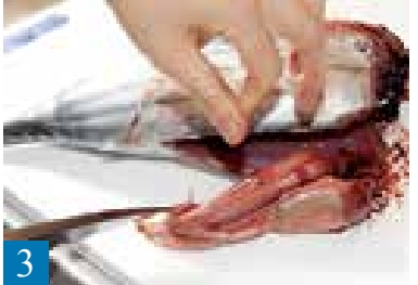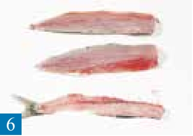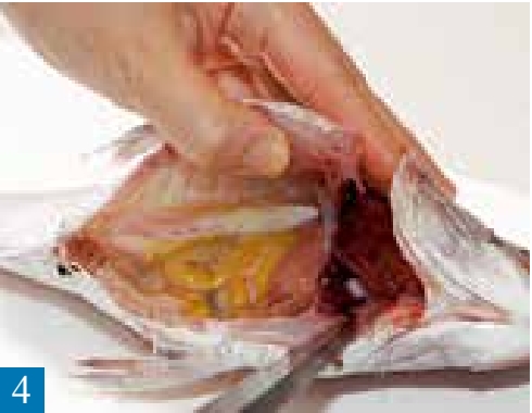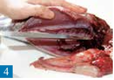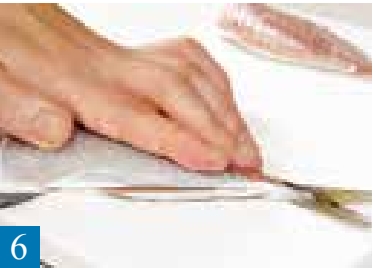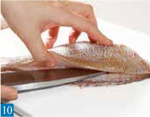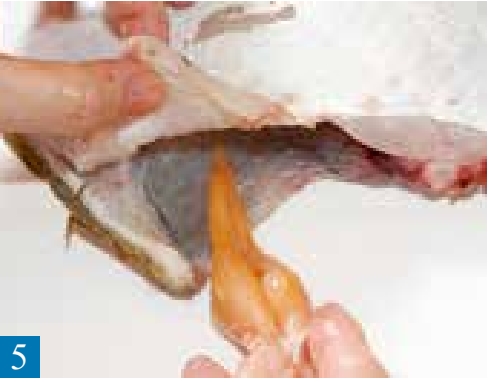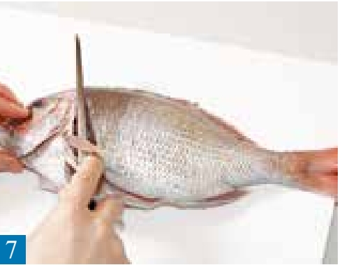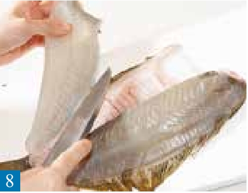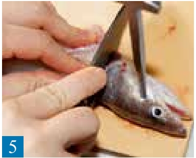 在另一面重复 3 的动作,保留胸鳍,切掉鱼头。