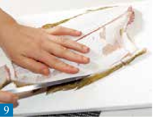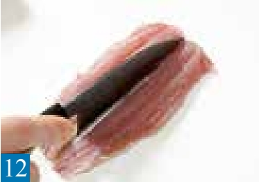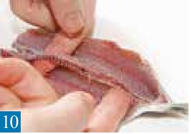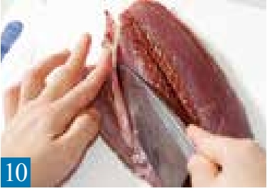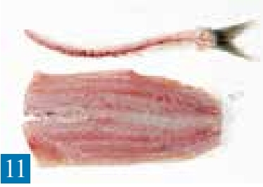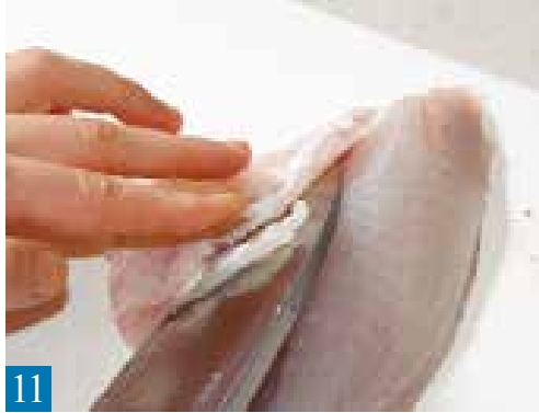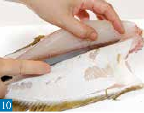 另一面沿着背鳍入刀,和 9 一样沿着中骨切开,让骨肉分离。