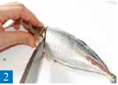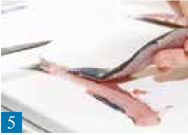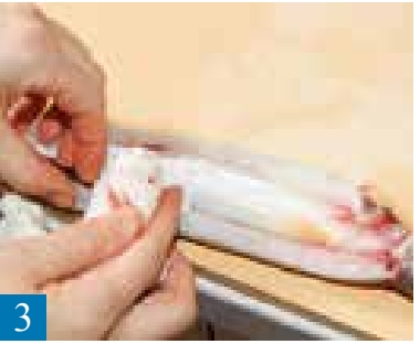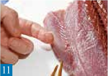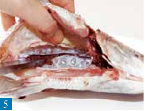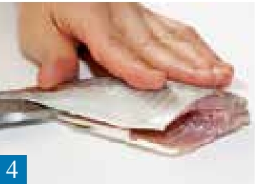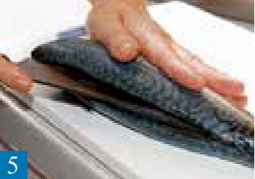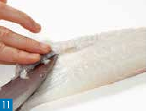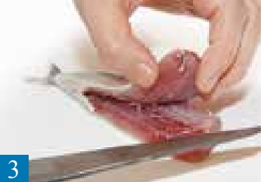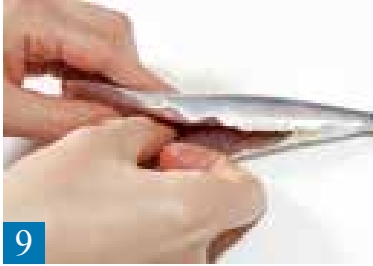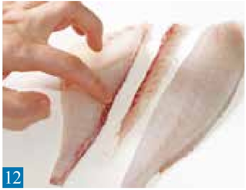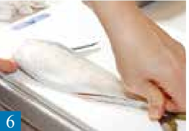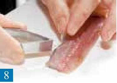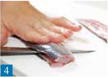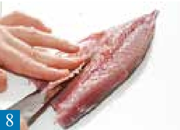 去除鱼身上下腹部鱼骨。用手触摸鱼肉,确认鱼骨清除干净。