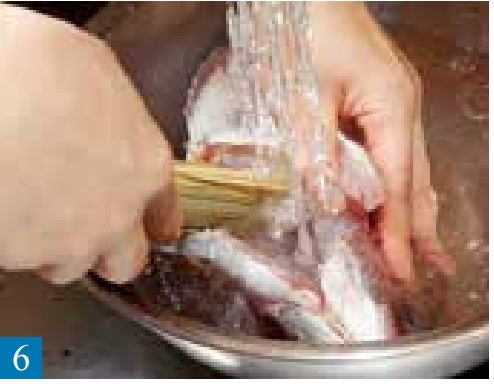 用水清洗鱼肚,最好在流水下用竹刷清洗,将血合洗净。