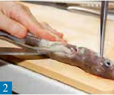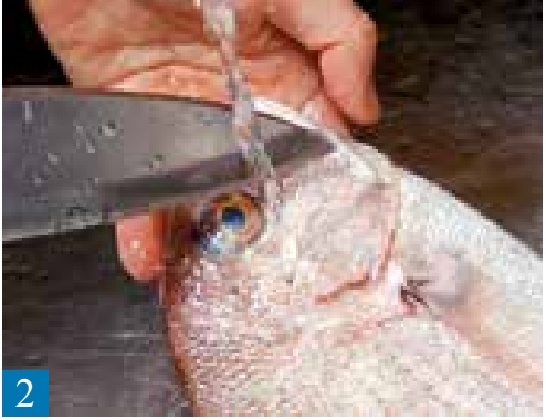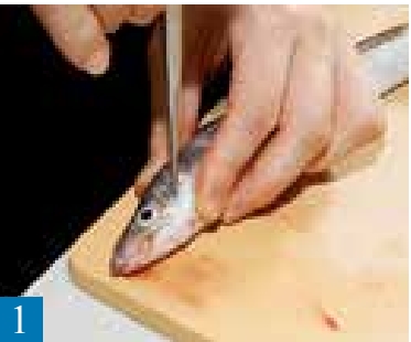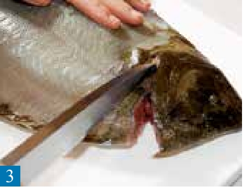 使用大名切。从鱼胸和腹鳍后面入刀,切掉鱼头。
