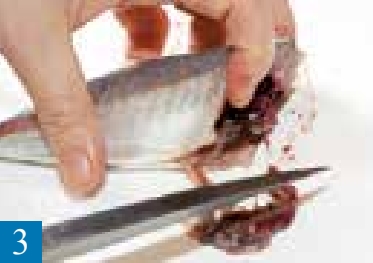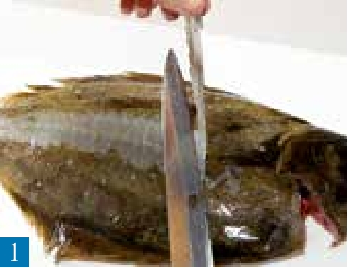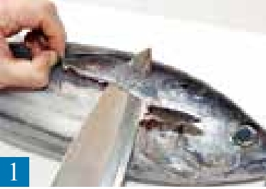 将鱼翻面,重复相同动作。自两边背鳍的根部和鱼身中间入刀。