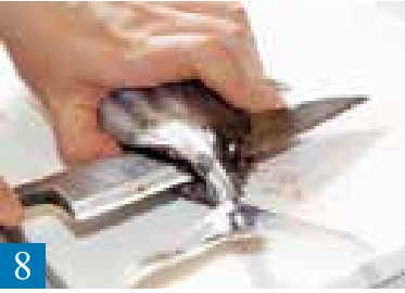 鱼头、鱼鳍附近的鱼鳞,边用流水冲洗,边用出刃刀的刀尖或刀底刮掉。