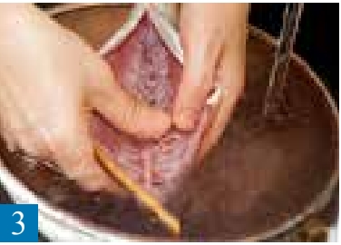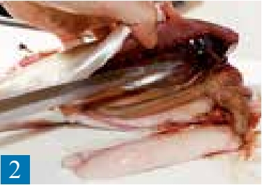 切开腹部到肛门,取出内脏,刺破血合袋。