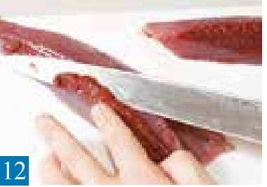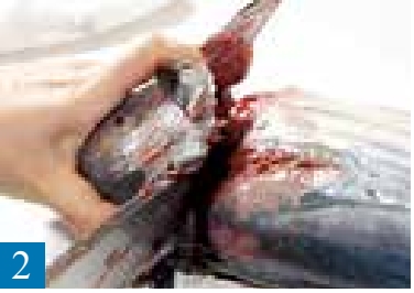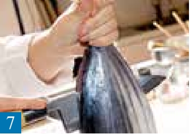利用鱼本身的重量,用下切方法片鱼。用手把鲣鱼抓起来,切的时候让鱼保持直立状态。
