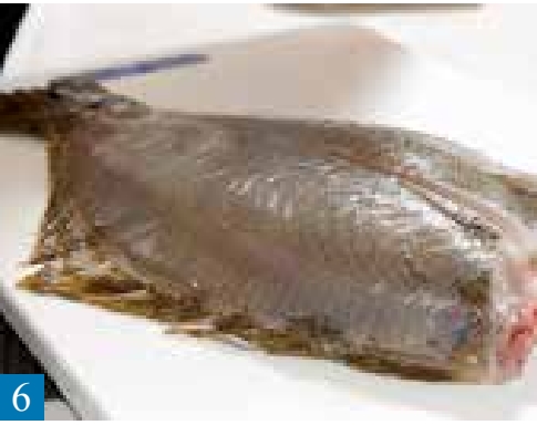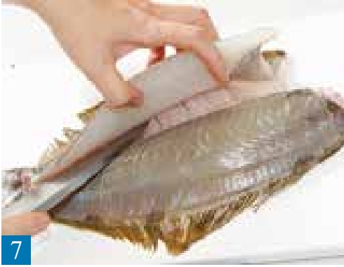比目鱼鱼身又薄又平,身体较宽。要切成上侧两片,下侧两片、中骨,总共5片。