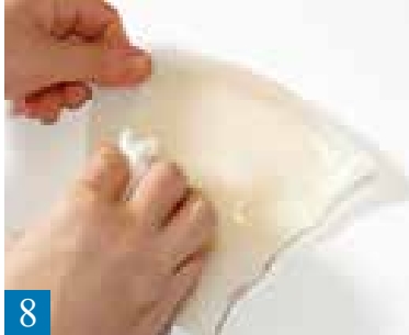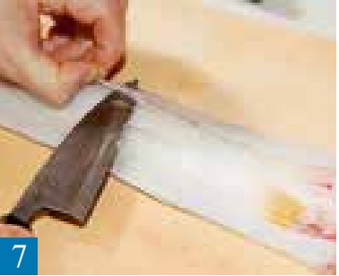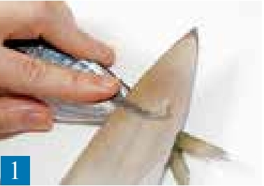 沿着墨鱼鳍一端的软骨垂直用刀,划一刀只留下一层皮。