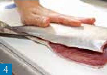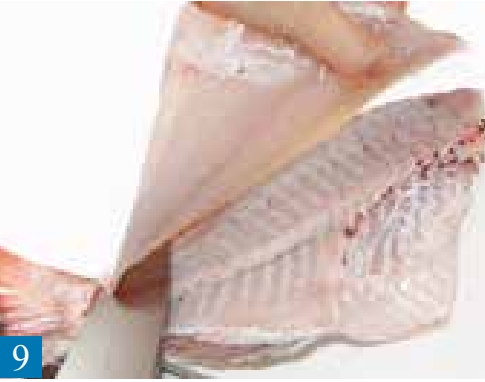 沿着背鳍切下鱼肉。另一面重复相同动作让骨肉分离。这些步骤要在鱼肉没有回温前尽快完成。