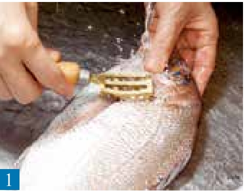 淋湿鱼皮,从鱼鳞和鱼身之间入刀,沿着身体刮除整条鱼的鱼鳞。