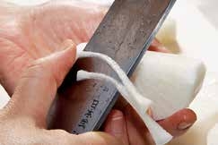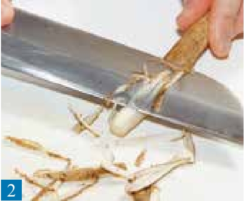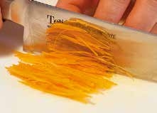 用菜刀的刀尖,从一端开始切成宽约1mm的细丝。