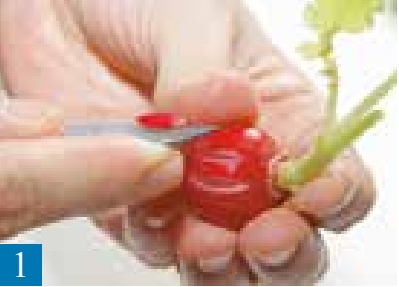 轻轻清洗樱桃萝卜,用菜刀在上面划V字。