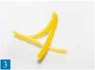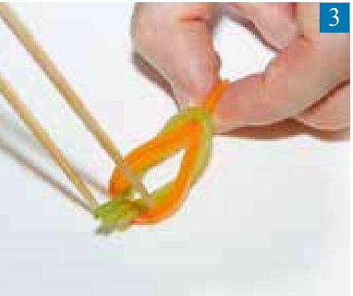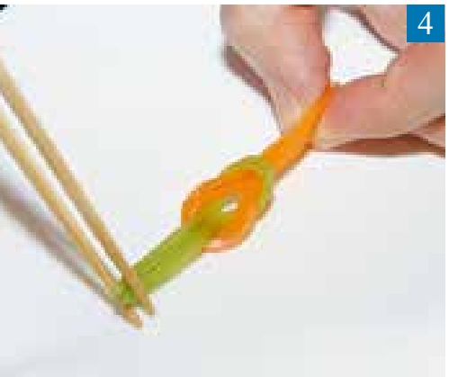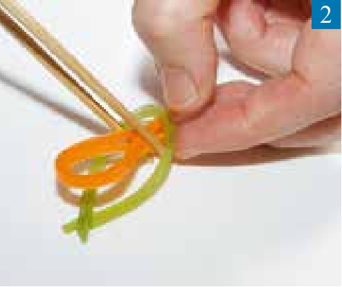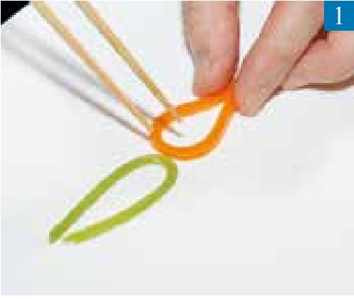 将蔬菜弯成U字型后相互重叠,使用竹签和手指,其中一条的前端穿过另一条的圆圈里。