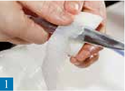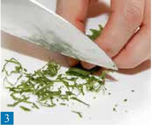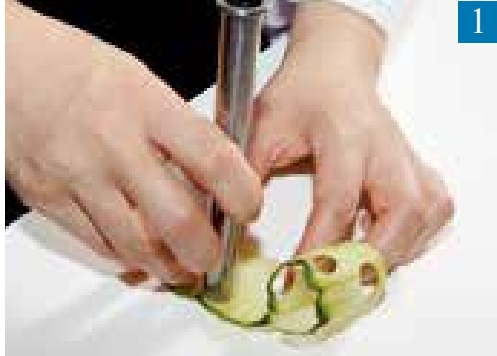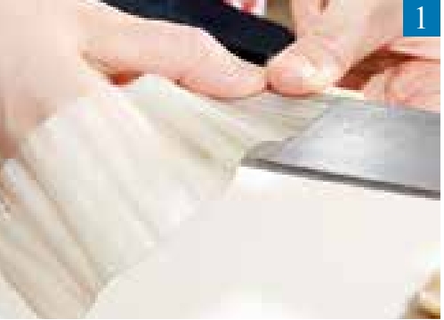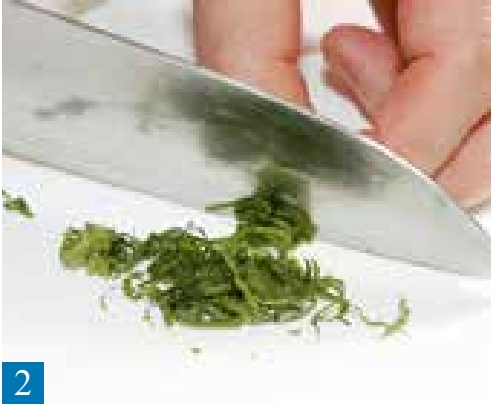 沥干 1 的水分,卷成筒状。用盐水稍微焯过的鸭儿芹绑起来,切掉多余的部分。