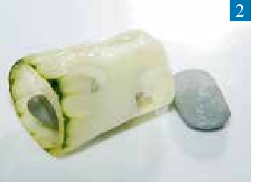 将3cm~4cm宽的黄瓜削成薄片,用模具压出空洞。