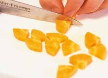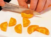 将切好的半圆再对半切,因为形状和银杏叶很像,也叫做银杏切。