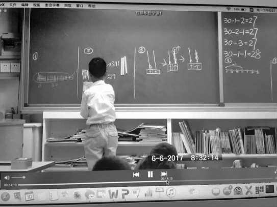 本课所研究的是30减3整十数减一位数的退位减法。本节课的另一个重点就是培养学生知识间的迁移能力,体会计算方法的多样化。通过前一阶段的学习与培养,孩子们的解题方法真的是多种多样。大家纷纷上台展示自己的方法,并积极和其他同学交流,在交流中,时刻透出课堂四声在数学课上的重要作用。一位教育家说过:“儿童的智慧就在手指尖上!”当孩子们在课堂本上、黑板上画出自己的解题方法后,再让他们亲自动手操作,可以起到事半功倍的作用。