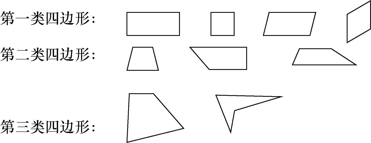 四边形真的存在这三类吗?同学们开始进行验证,将找到的四边形贴在黑板上。此时一生提出质疑:根据“对边是否平行”来分类,就只有这三类吗?还应有第四类四边形。这时有同学反对:没有啦。一位同学提议:口说无凭,那咱们画画看,看谁能画出第四类?这一“质疑”激起了所有同学的兴趣,大家都抱着半信半疑的想法画起了四边形。最后纷纷得到证实:四边形没有第四类。