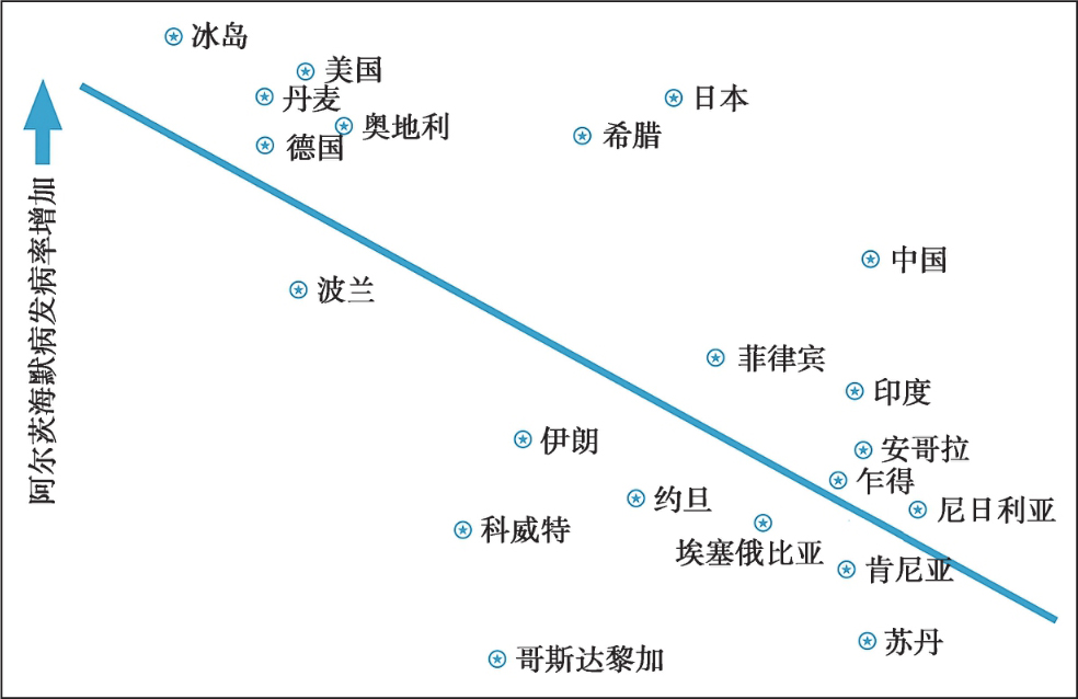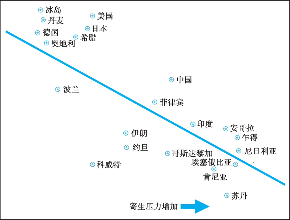 请大家注意,图1-1中寄生物水平最高的国家(如肯尼亚)同样也是图1-2中阿尔茨海默病发病率最低的国家。