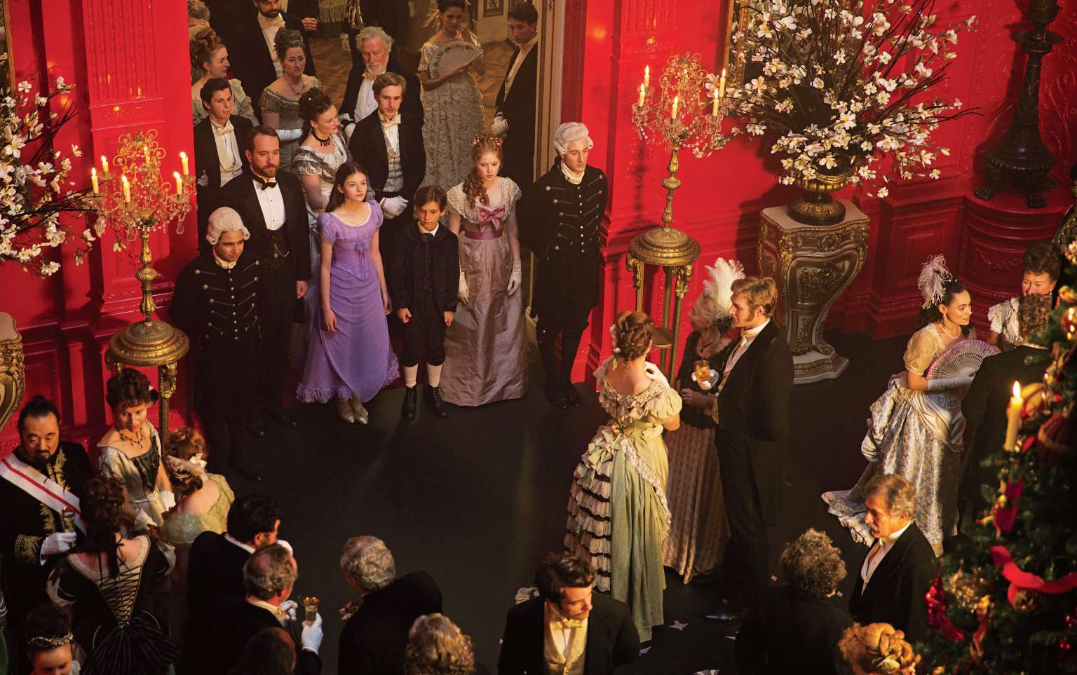 They entered Drosselmeyer's grand home to find the great hall bursting with cheer. Guests danced around a towering Christmas tree glittering with ornaments and lights. Clara pushed through the crowd and began searching for her godfather.