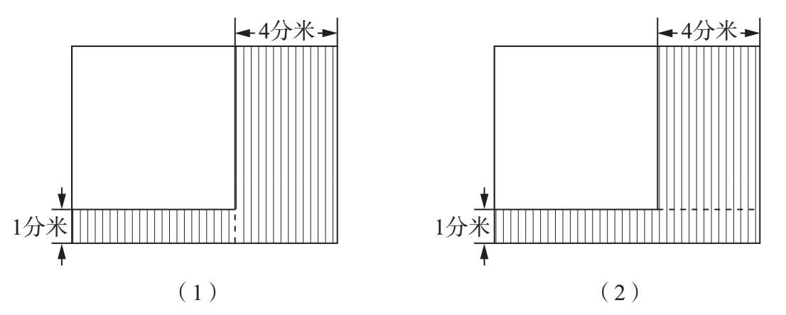 分析 初看起来,图中长方形长和宽,正方形的边长都不知道,无法求出长方形的面积,能否用特殊的方法思考呢?审题后发现长方形的长、宽和面积都和正方形有关系。对于图中的阴影部分,可以添一条“辅助线”,如图(1)或图(2),把它分解成两个长方形。以图(2)为例。记正方形的边长为x分米。带阴影的小长方形长为(x+4)分米,宽为1分米,带阴影的大长方形长为x分米,宽为4分米。“面积比原来(长方形)减少了49平方分米”,也就是大长方形阴影部4分 面1积+小长方形阴影部分面积=阴影部分总面积=49平方分米,可以用方程解。