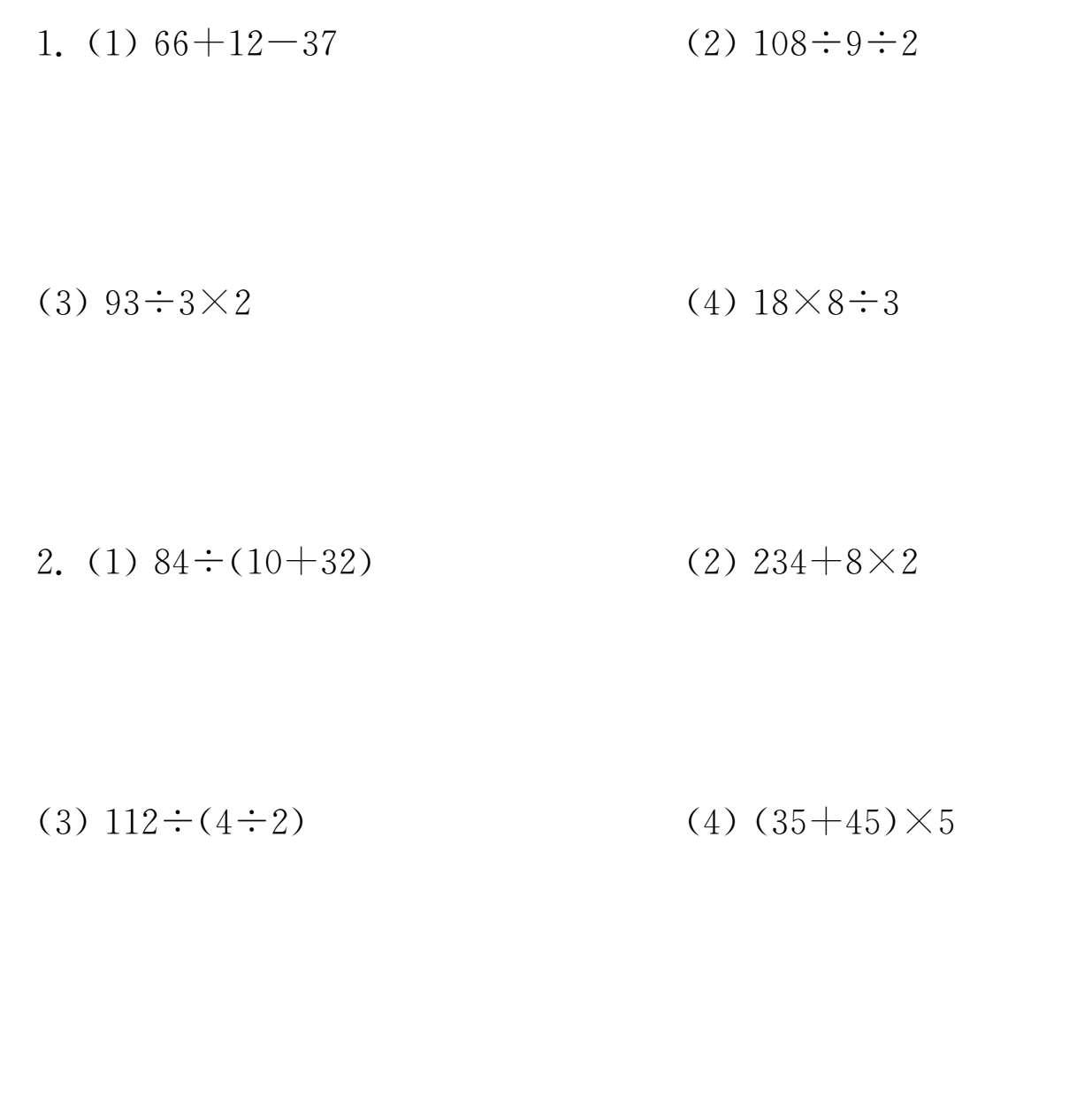 分析 当算式中没有括号,只有加、减或者乘、除时,从左往右按顺序计算;加减乘除都有时,先乘除再加减。当算式中有括号,括号里只有加减或者乘除时,则从左往右按顺序计算;加减乘除都有时,先乘除再加减。