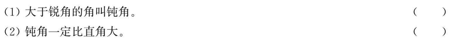 分析 锐角是大于0°,且小于90°的角;钝角是大于90°,且小于180°的角;直角等于90°。解 (1)×;(2)√